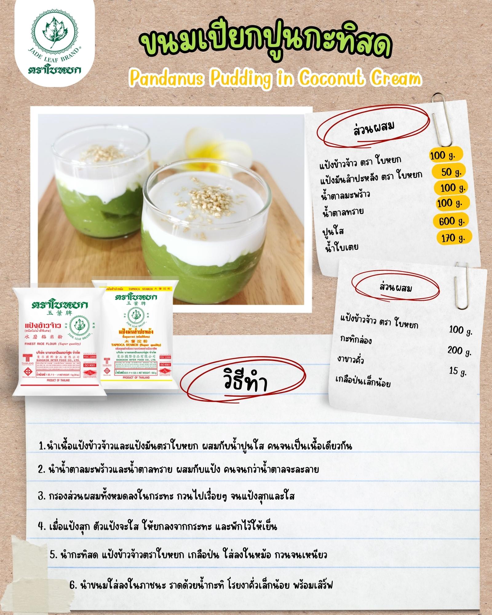 - นำกะทิสด แป้งข้าวจ้าวตราใบหยก เกลือป่น ใส่ลงในหม้อ กวนจนเหนียว